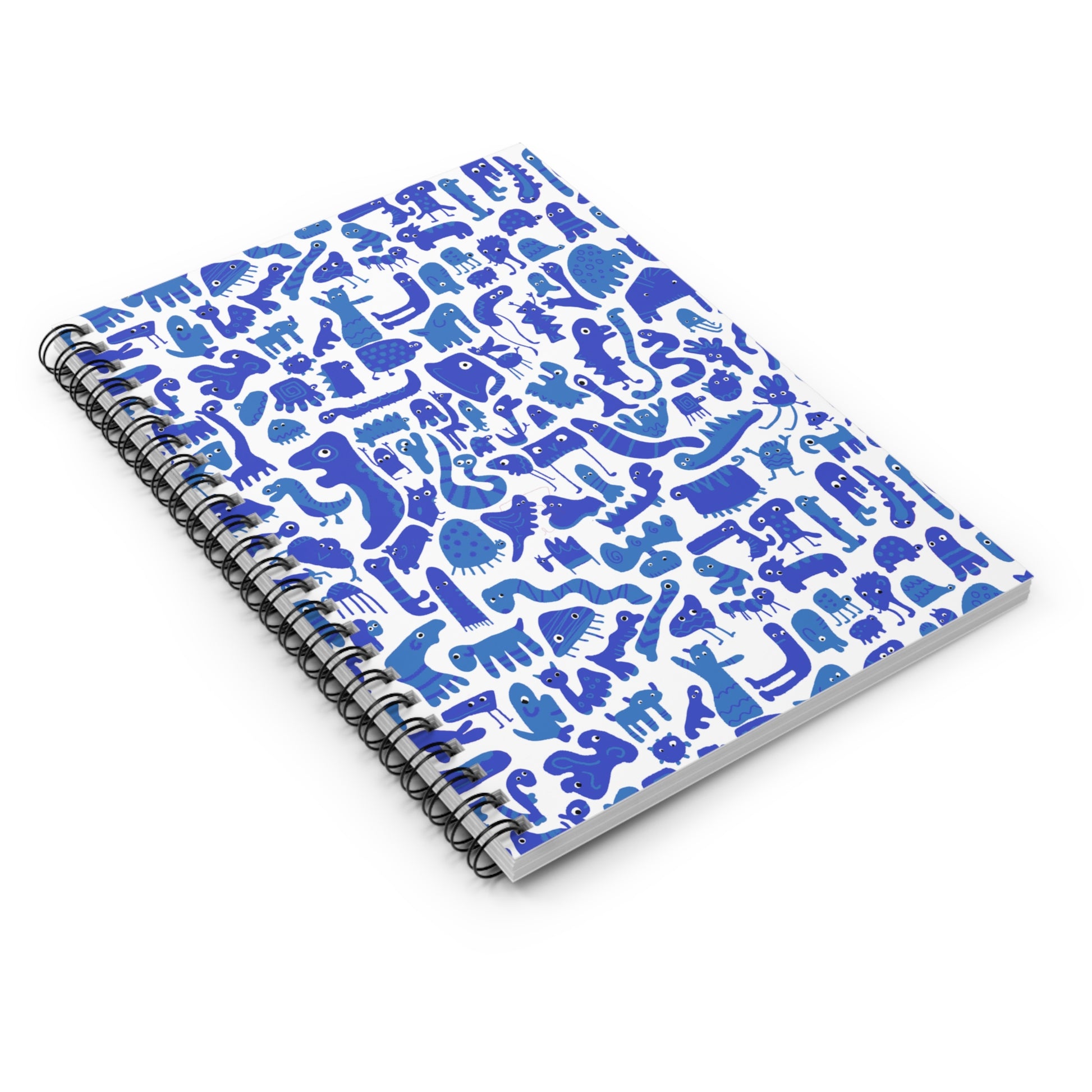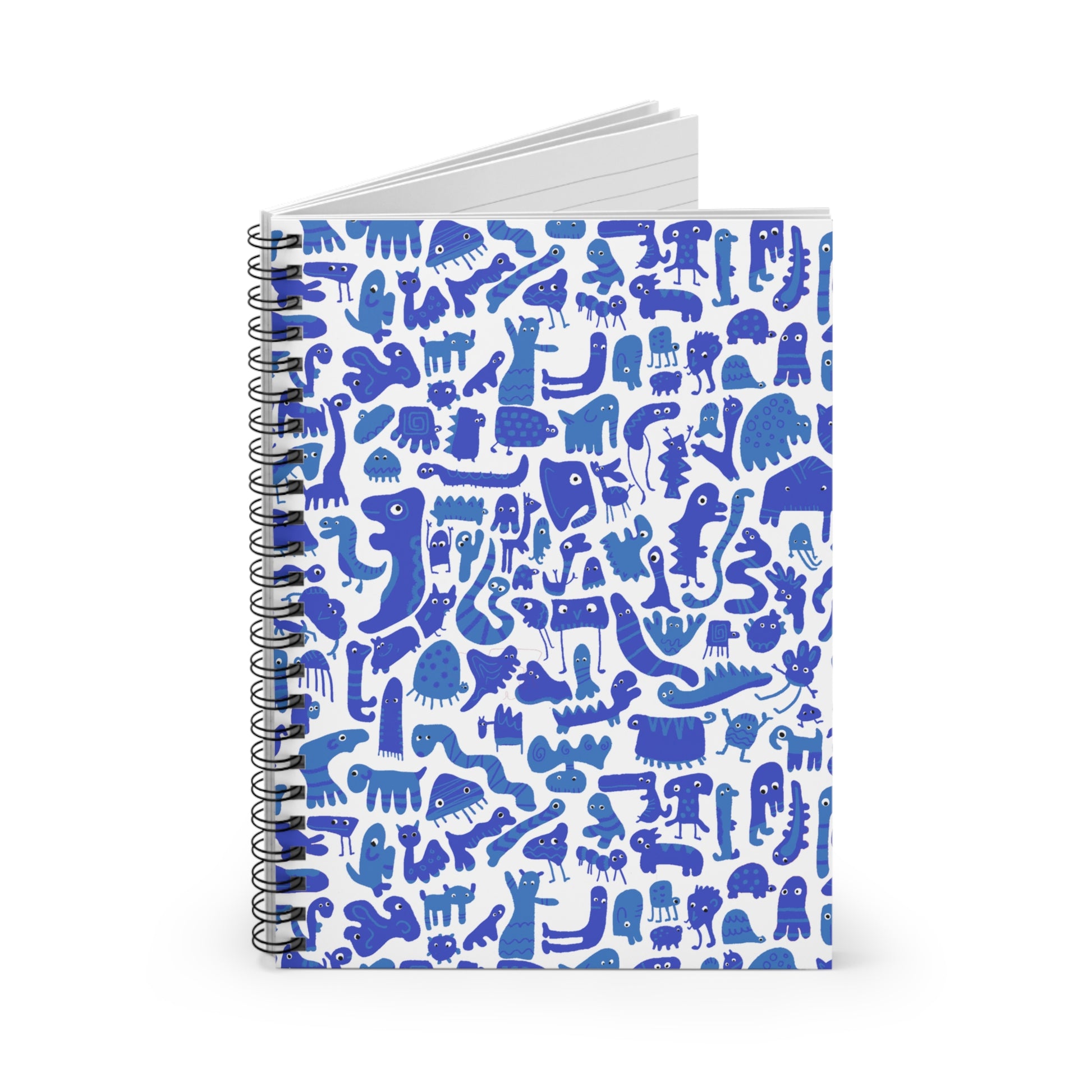 Blue Abstract Creature Spiral Notebook with ruled lines, perfect for kids going back to school or for journaling. Fun gift idea and great for classroom supplies. Product features - 90gsm paper for easy writing - Metal spiral for a fancy look and easy page removal - Document pocket for added storage - 6" x 8" size with 118 ruled line pages - Front cover print with dark grey back cover Care instructions - Use a soft, clean and dry cloth to gently brush any dust or dirt off from the center of book outwards.