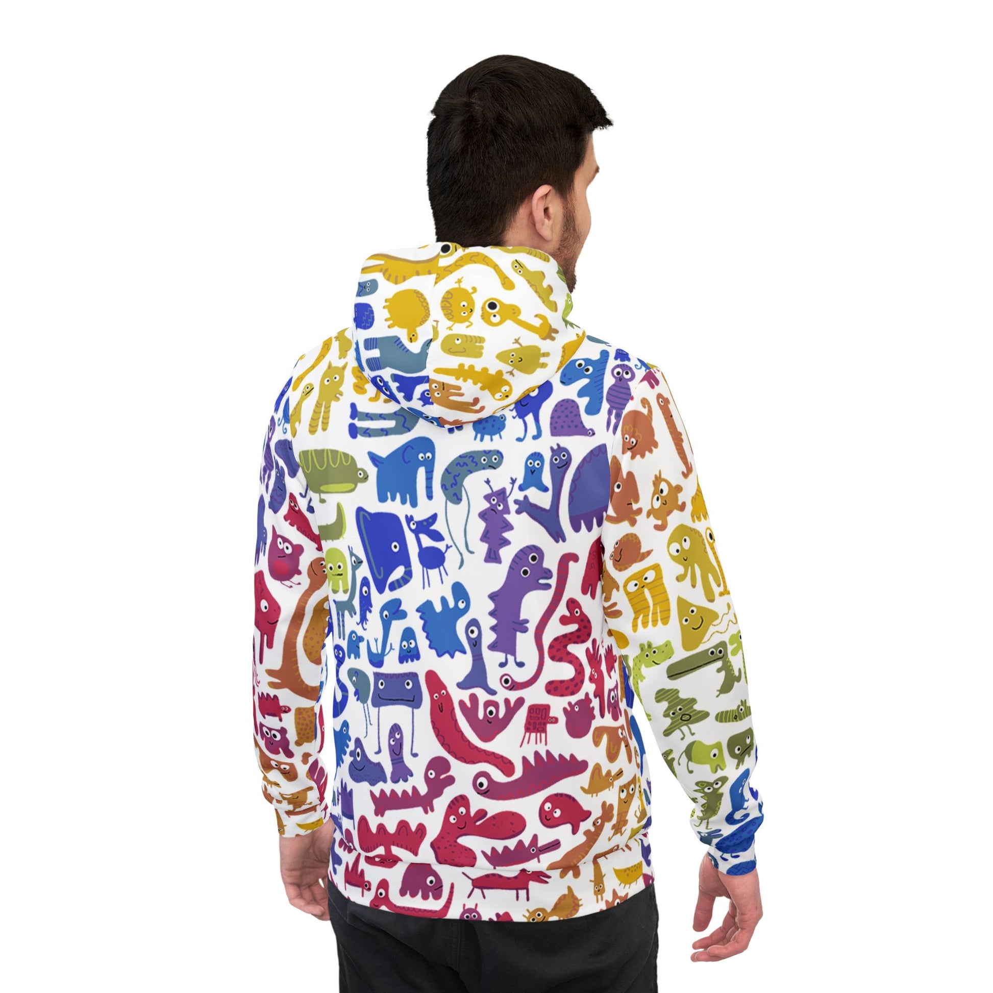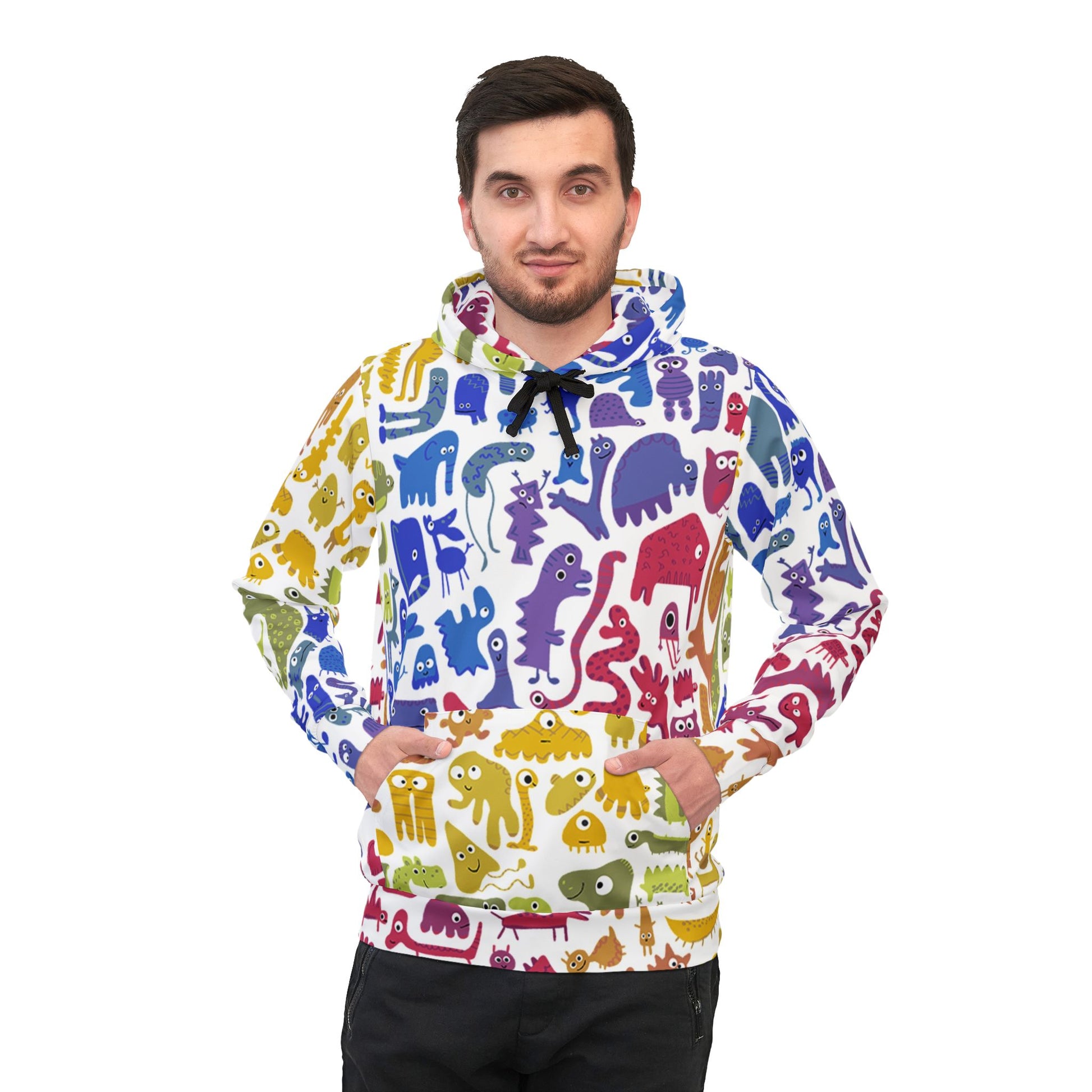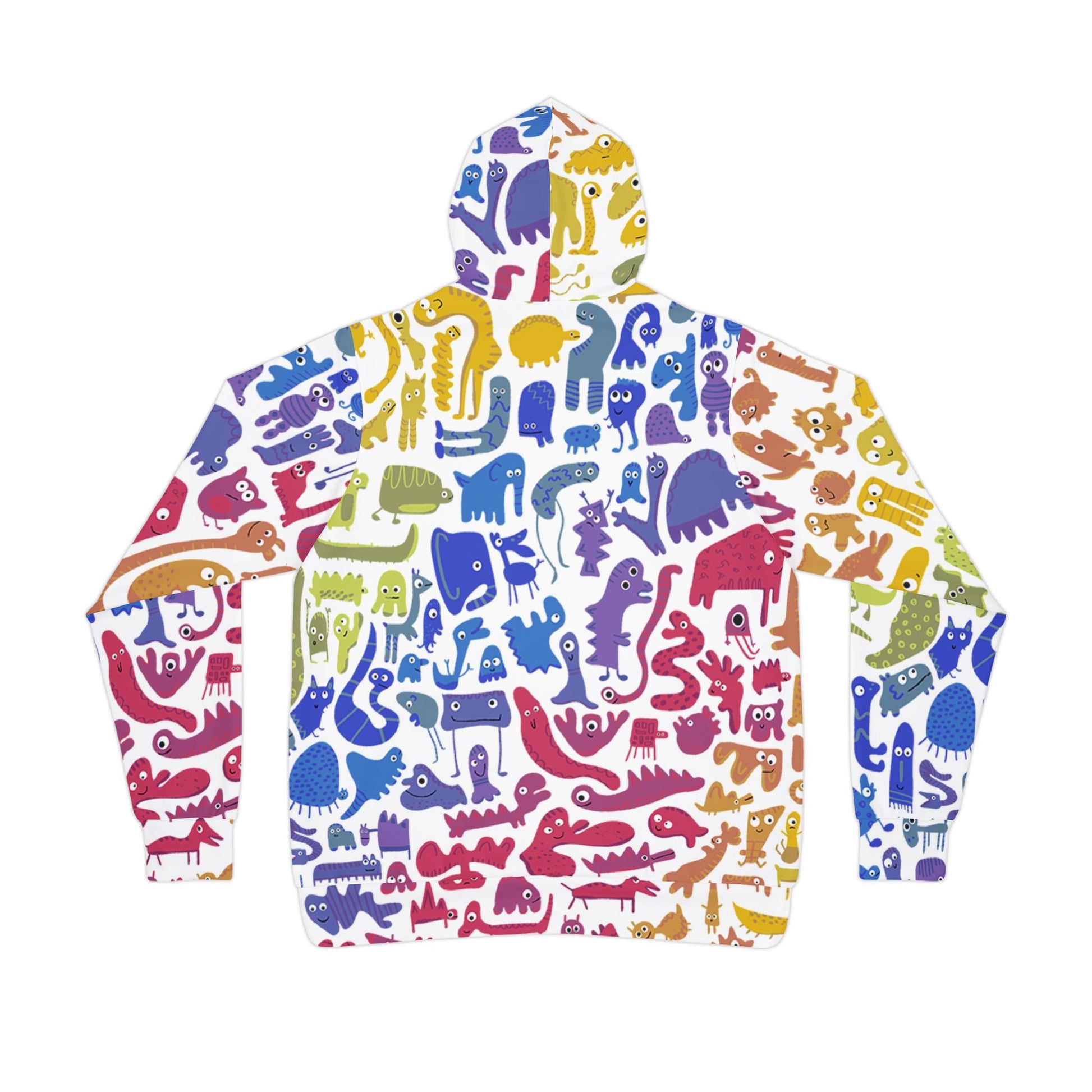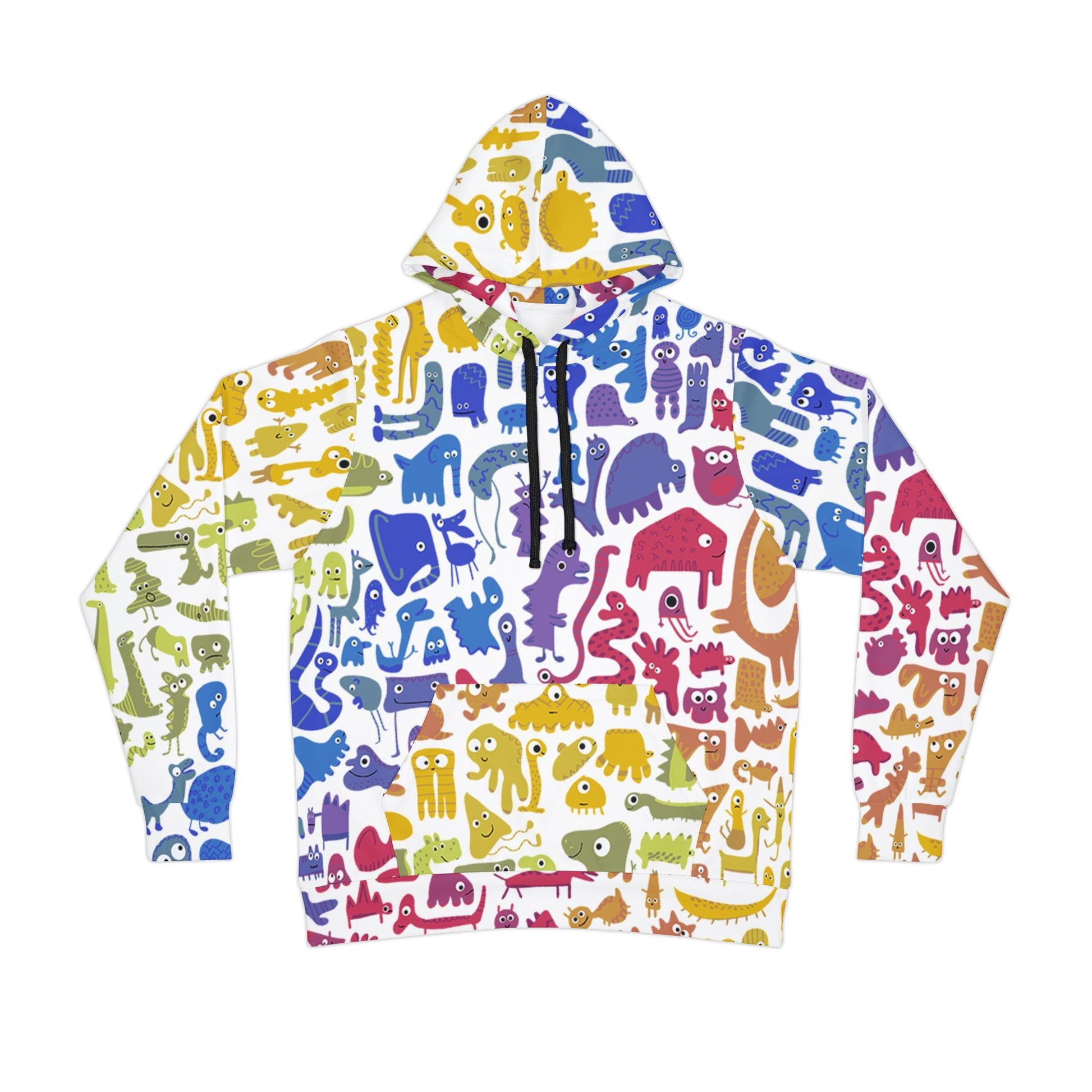 The rainbow hoodie design was made by me! A real human artist. Celebrate pride with this hoodie crafted from a blend of 95% recycled polyester and 5% spandex. It feels remarkably soft against the skin while allowing for versatile movement. The playful design filled with colorful creatures injects fun into your wardrobe, making it an ideal companion for casual outings, gym sessions, or lounging at home. Whether you're hitting the gym, celebrating pride or hanging out with friends, or running errands, this hoodie combines fashion with function. It's great for fitness enthusiasts, animal lovers, and anyone looking to showcase their unique personality. Celebrate your individuality during holidays, casual gatherings, or just as a treat for yourself! This hoodie makes a thoughtful gift for birthdays, holidays, or simply to brighten someone's day. Product features - Super soft and lightweight material for comfort. - Adjustable hood with black drawstrings for a customized fit. - Conveniently sewn-in size and care label for easy maintenance. - Unique custom waistband label option for personalization. - Made from 95% recycled materials, promoting sustainability. Care instructions - Do not dryclean - Iron, steam or dry: low heat - Drip dry - Do not bleach - Machine wash: inside out in cold water (max 30C or 90F)
