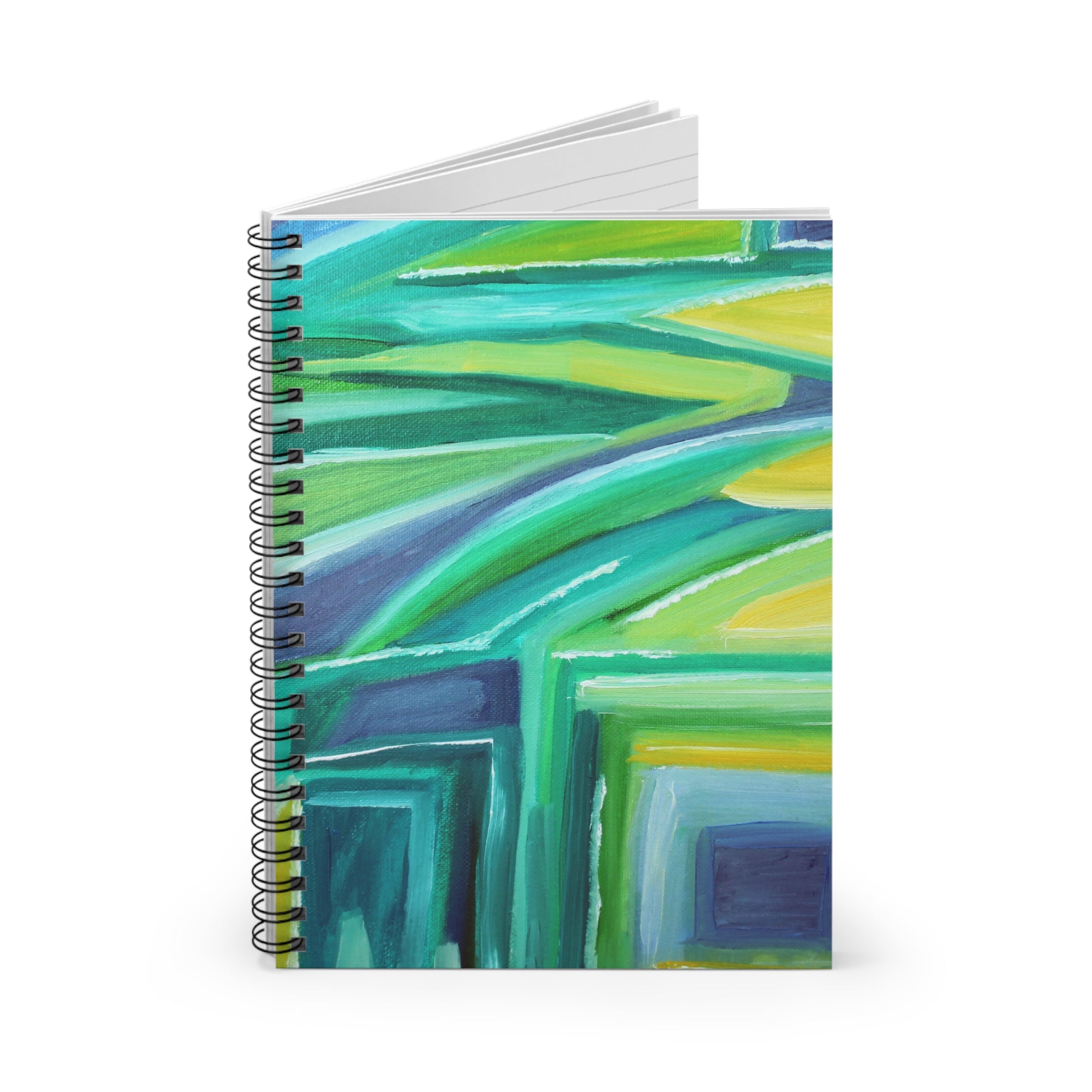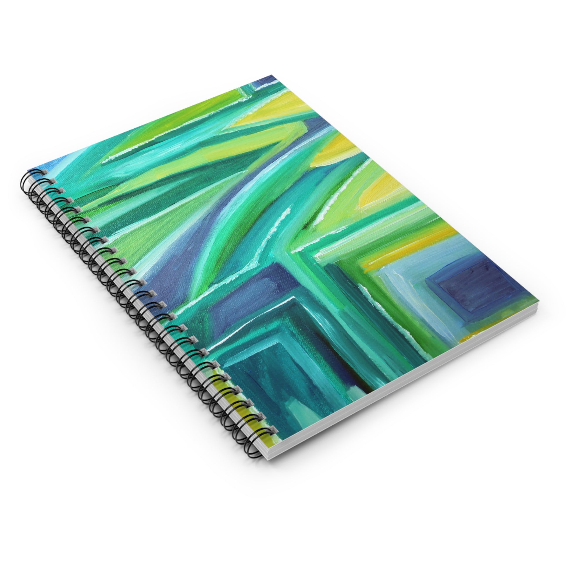 Vibrant Spiral Notebook - Ruled Line for Creative Minds with a green abstract painting design shapes. Perfect for writers and creatives looking for a fancy notebook with added storage. Ideal for back to school, office, or personal use.